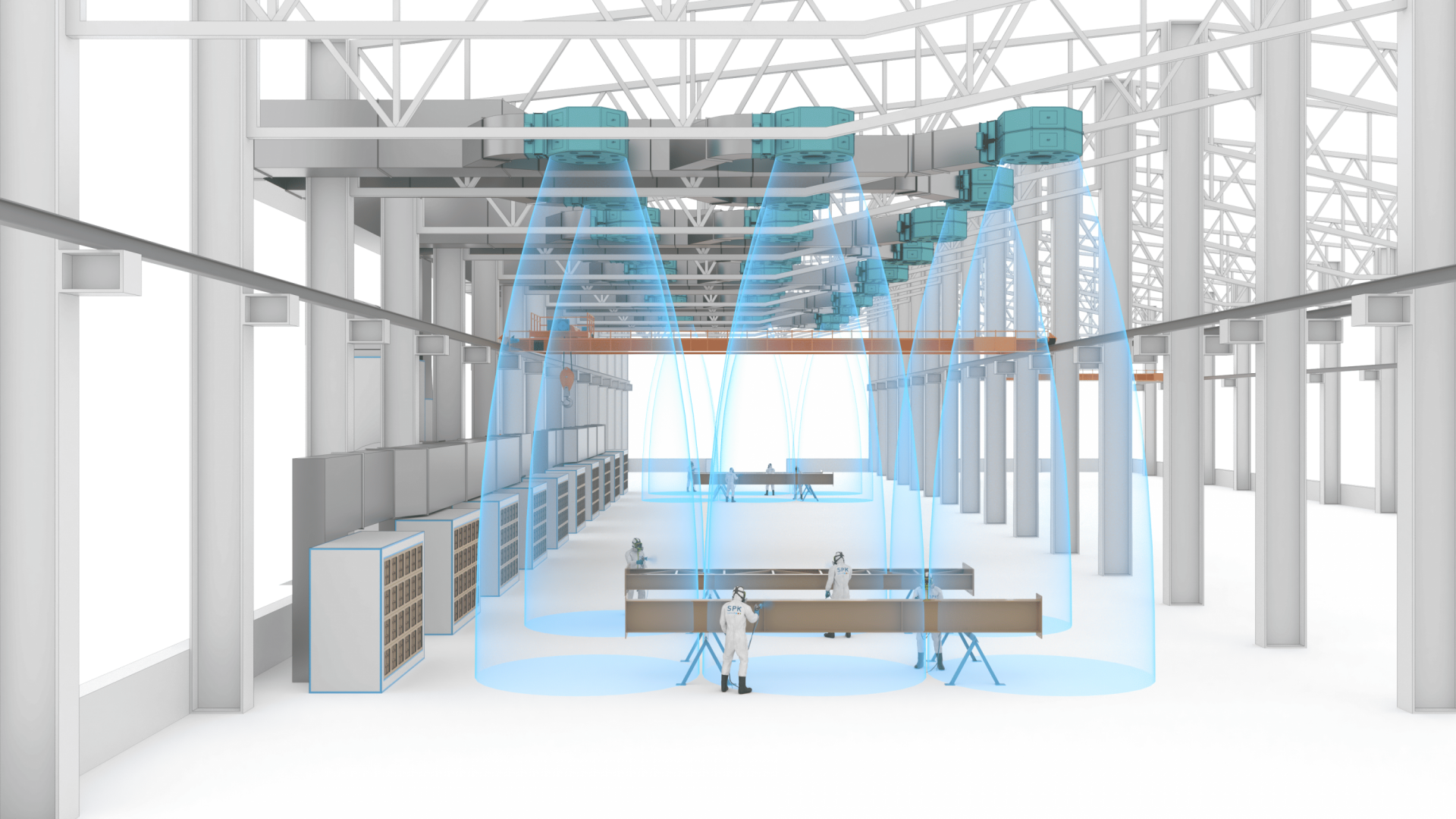 Зона открытой окраски предназначена для безопасного окрашивания изделий в пространстве участка окраски. Изделия размещаются под группой воздушных сопел для возможности окраски со всех сторон, с обеспечением проезда для стремянок и прохода для персонала.
