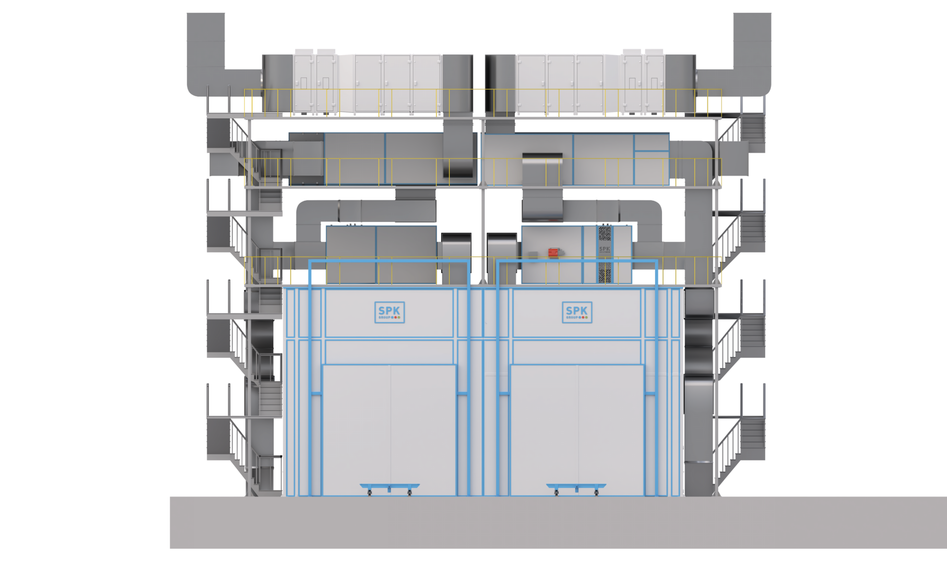 Окрасочно-сушильная камера обитаемая проходного типа SPK-SСB-13.5.5 предназначена для безопасной окраски и последующей сушки различных поверхностей изделий и металлоконструкций с помощью метода жидкостного нанесения.