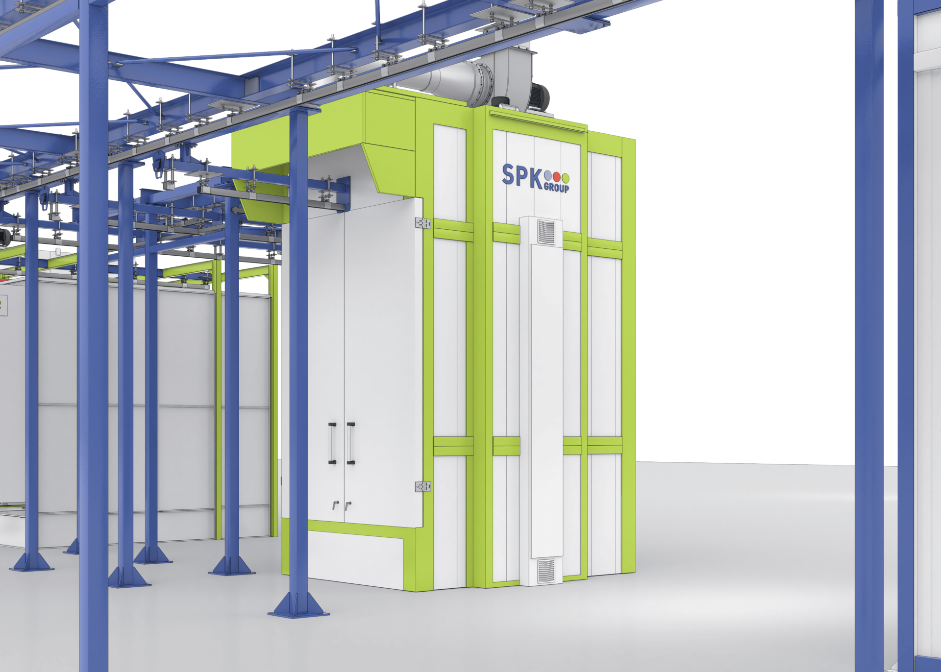 Комплекс оборудования для химической подготовки и порошковой окраски изделий с подвесным конвейером для нефтегазовой отрасли