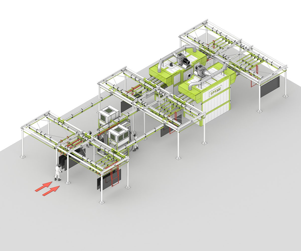- Подвесной транспортной системы (плоско-параллельный конвейер с ручным перемещением; завеска на траверсу и снятие изделий производится вручную операторами либо с помощью кран-балки Заказчика; распределенная нагрузка на одну траверсу — до 300 кг