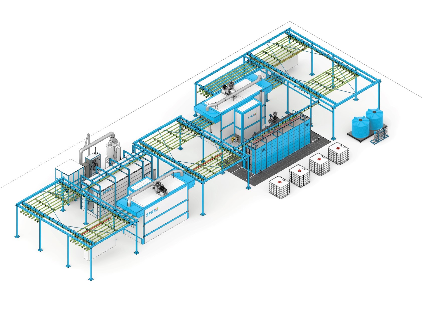 - Автоматизированная установка порошковой окраски (АХПП) с системой качения, предусматривающая около пяти ступеней обработки изделий.