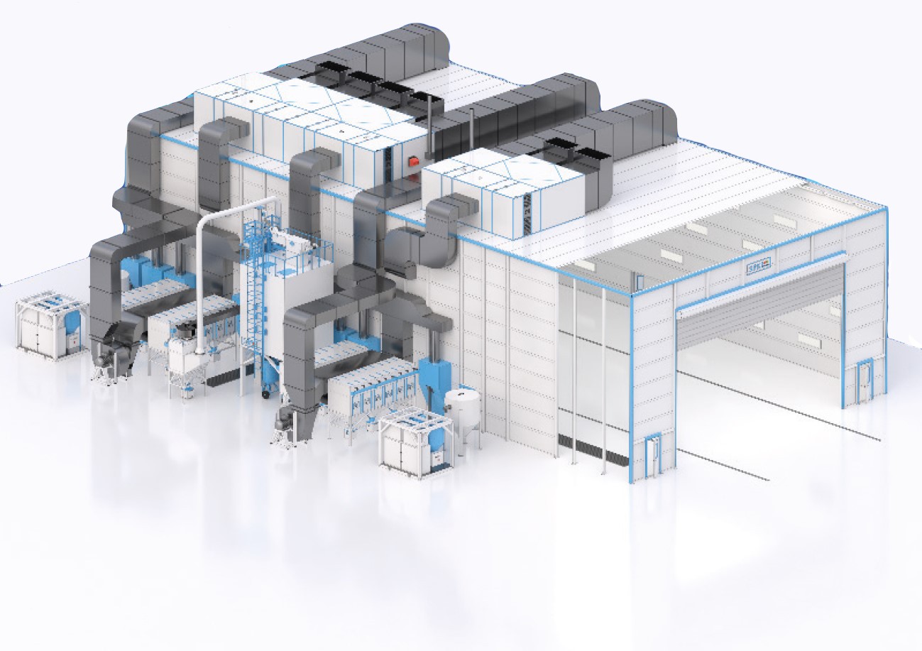 Дробеструйно-окрасочно-сушильная установка модели SPK-SBSCB-36.18.10 представляет собой современный комплекс, предназначенный для проведения очистки, окраски и сушки судовых блоков и сборных конструкций. Объекты перемещаются внутри камеры на тележках с гидравлическим подъемником, а для обработки изделий на высоте используются быстроустанавливаемые леса.