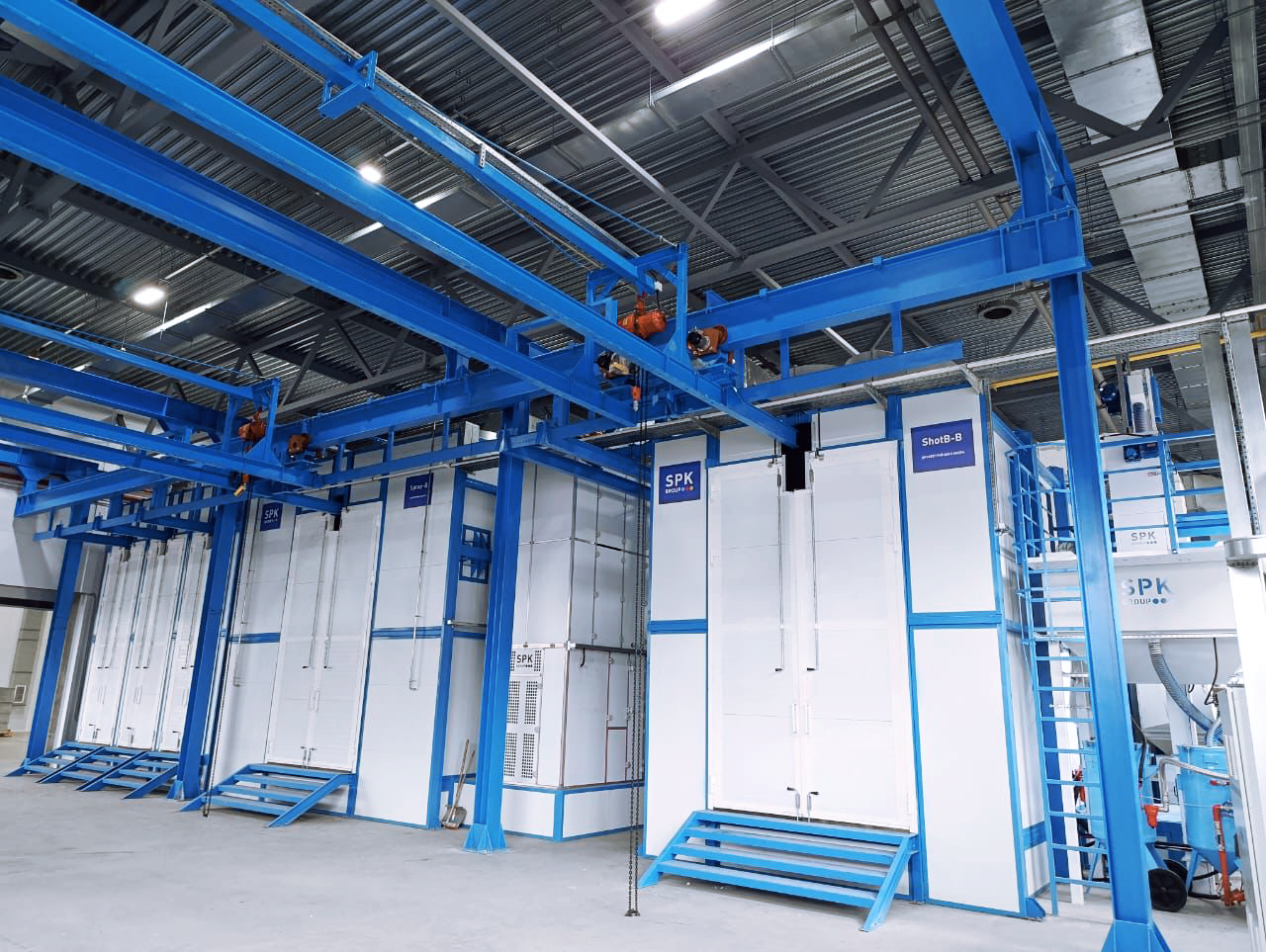 С помощью конвейера в единый комплекс соединены дробеструйная камера на 2 оператора, окрасочная камера с перспективной модернизацией роботами, трехсекционная сушильная камера. Дополнительно предусмотрено красокприготовительное отделение, а также оборудование для смешивания и подачи краски.