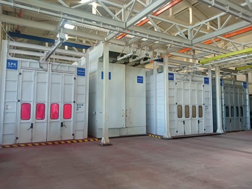 Оборудование линии: камера моечная с внутренними габаритами 13000х4000х4000 мм, камера дробеструйной очистки 13000х4000х4000 мм, камера полимеризации 12000х3000х4000 мм, окрасочная камера 13000х4000х4000 мм, ручная монорельсовая транспортная система.