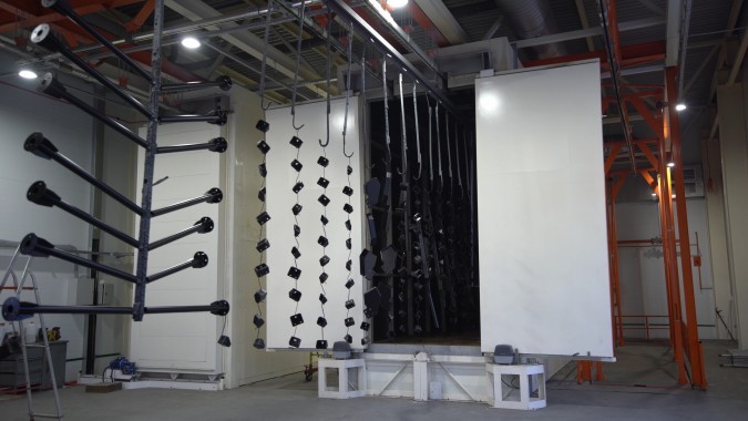 - Камеру обезжиривания и фосфатирования автоматическую. Внутренние габариты – 10х2х5 м. Назначение камеры – автоматическая обработки изделий химическими реагентами при помощи струйного облива. Воздухообмен для вытяжки – 1.600 м3/ч. Все вентиляционное оборудование выполнено в коррозионностойком исполнении. Моющий раствор нагревается при использовании природного газа. Мощность тепловая составляет 200 кВт. Максимальная температура сушки – 140 градусов. Предусматриваются автоматические сдвижные ворота. Тупиковое исполнение камеры. Внутренняя поверхность стен выполнена из нержавеющей стали. Наполнитель стен – PIR. Конструкцией камеры предусмотрены: стационарный контур облива изделий со 196 форсунками, система автоматического дозирования моющих и фосфатирующих реагентов с постоянным контролем Ph, маслоотделитель, нагрев моющего раствора, а также установку для деминерализованной воды, трехстадийную систему подачи слива стоков.