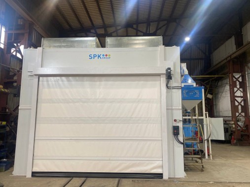 В основе кабины камеры дробеструйной очистки – каркас из металла с обшивкой сэндвич-панелями. Внутри камеры устанавливается резиновое покрытие потолков и стен для защиты от воздействия дроби. В камере предусмотрены въездные ворота габаритами 4х3 м, а также сервисная дверь размером 0,8х2 м.