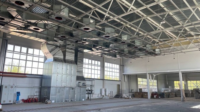 Установлено 16 2-хпоточных сопел направленного действия. 32 воздушных регулируемых ручных клапана. Общепромышленный вентиляционный агрегат SP (50), расход воздуха – 50.000 куб. м в час. Пластинчатый рекуператор тепла. Шкаф автоматики. Панель управления сенсорная.
