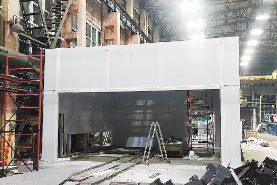 Транспортировочный проем закрывается подъёмными воротами секционного типа, размером 7500 х 3500 мм.